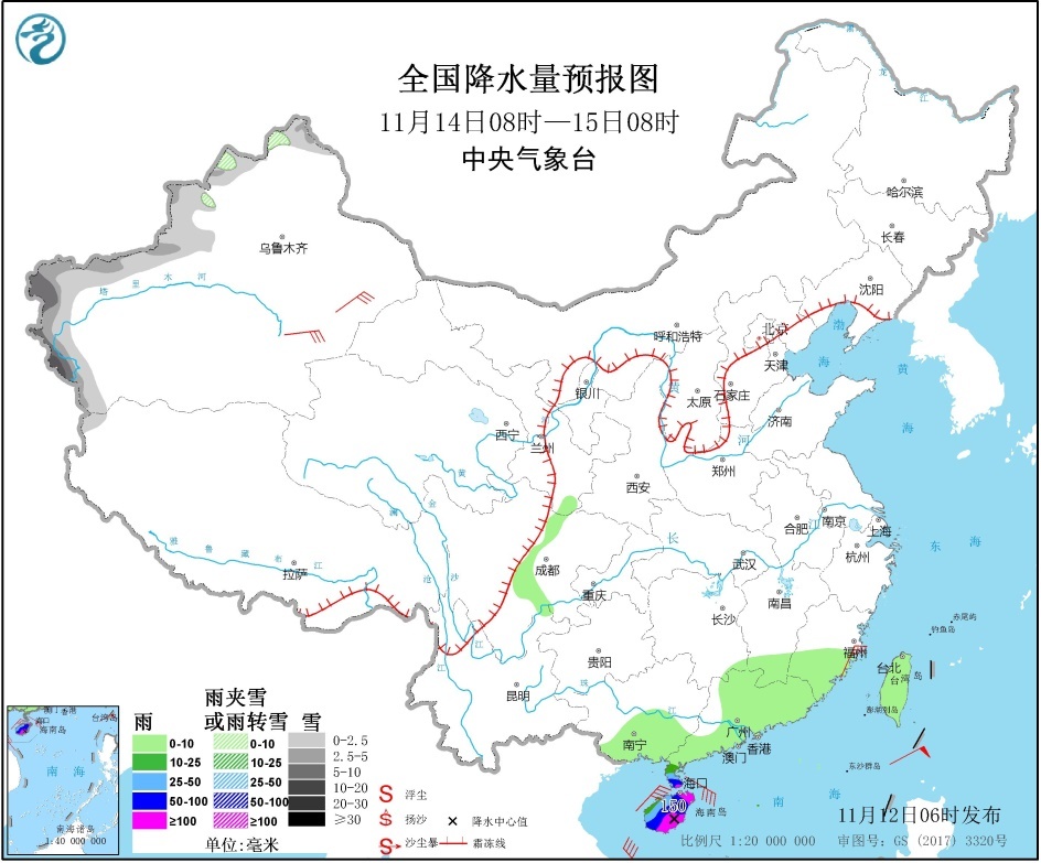11月14日08时至15日08时,新疆北疆北部、伊犁河谷和南疆西部山区等地部分地区有小雪中雪或雨夹雪,南疆西部山区局地有大雪或暴雪。广东西南沿海和海南岛等地有中到大雨,其中,雷州半岛南部、海南岛中东部等地部分地区有暴雨或大暴雨(100~150毫米)。新疆南疆盆地和东部的部分地区有4~6级风(见图3)。