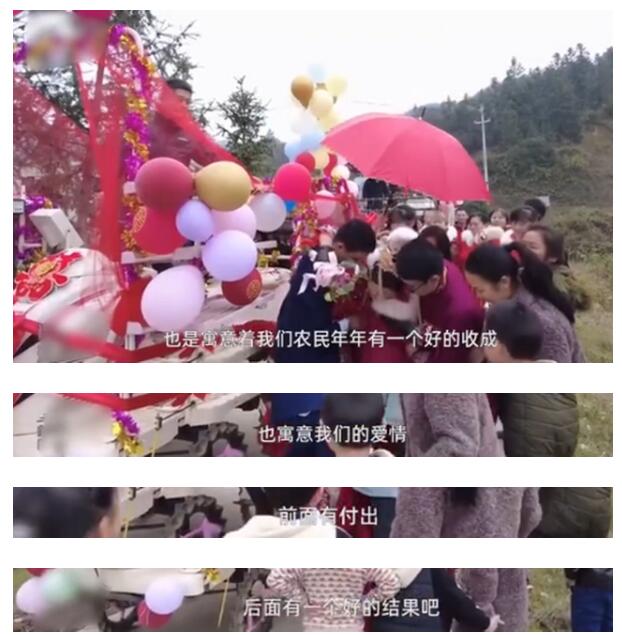 近日,湖南安化,一对返乡创业的大学生结婚,出动6台农机当婚车。新娘穿中式礼服坐在插秧机上笑得开心,后面跟着一台收割机和四台旋耕机。新娘夏女士说,插秧机和收割机也寓意爱情有付出有回报。