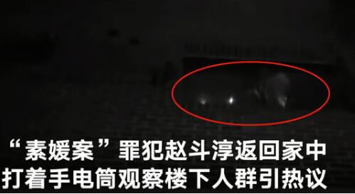 12月12日,韩国“素媛案”罪犯赵斗淳出狱返回家中,打着手电筒观察楼下人群。当天上百人堵在赵斗淳家门口围观,其中不乏前来直播的博主,赵斗淳打着手电筒观察楼下时恰好被直播画面拍下,虽然楼下民众大声斥骂他,他仍继续观察。