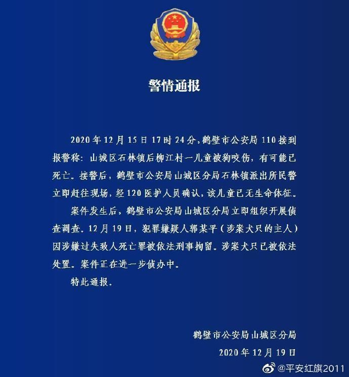 12月19日,鹤壁市公安局山城区分局发布警情通报称,案件发生后,鹤壁市公安局山城区分局立即组织开展侦查调查。12月19日,犯罪嫌疑人郭某平(涉案犬只的主人)因涉嫌过失致人死亡罪被依法刑事拘留。涉案犬只已被依法处置。案件正在进一步侦办中。