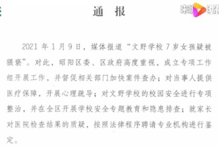 近日,多家媒体报道,云南昭通一名7岁女孩疑在学校宿舍里遭人猥亵受伤,当地警方已进行立案调查,尚未找到凶手。1月9日,女孩家长和学校沟通无果,做出了跪在学校门口求公道的举动,引发网友关注。1月10日,昭阳区人民政府发布通报称,针对“文野学校7岁女孩疑被猥亵”一事,已成立专项工作组开展工作,并对文野学校的校园安全进行专项整治。