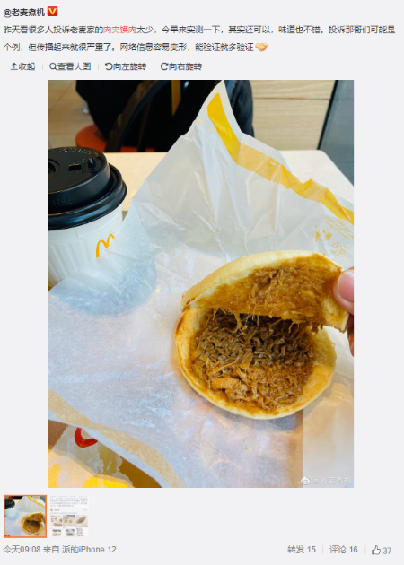 从网友的体验来看,不同地区的麦当劳肉夹馍还不一样,很多人买到的确实只有很少的肉,可以说只有少量肉丝,跟想象中的肉夹馍完全不符,跟宣传图的差别就更大了,完全不是一回事了。