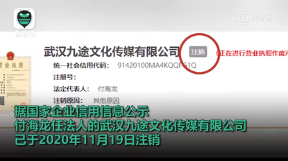 付海龙担任法定代表人、斗鱼持股的武汉九途文化传媒有限公司已于2020年11月19日注销。视频截图