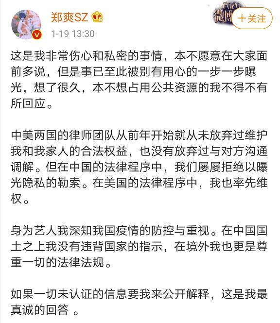 19日,郑爽回应称,这是自己非常伤心和私密的事情,本不愿意在公众面前多说,“身为艺人我深知我国疫情的防控与重视。在中国国土之上我没有违背国家的指示,在境外我也更是尊重一切的法律法规。” 中央政法委长安剑发文称,“郑爽的回应,却通篇强调自己没有违法,丝毫没有任何悔过、道歉的意思。”