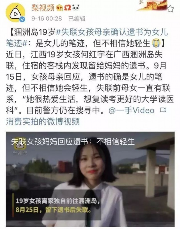 看到一则痛心的新闻: 22岁涠洲岛失联女孩确认死亡。
