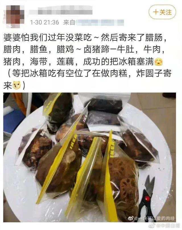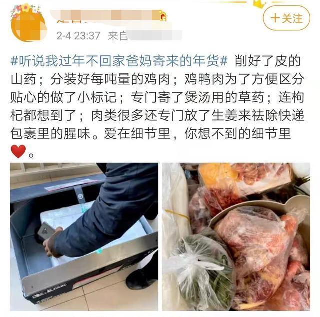 最近你收到老家的年货了吗?今年春节不少人选择就地过年爸妈的宠爱也纷纷变成了沉甸甸的快递从四面八方飞驰而来爸妈寄来的年货有多厉害?“好家伙!差点没把冰箱直接给我邮来”60斤的大包裹17斤饺子鸡鸭鹅猪牛羊蒸的酱的炸的腊的……为了能让孩子吃上家乡的味道父母恨不得把冰箱直接搬过来↓↓↓还有“画风清奇”的收到家里寄来的一头羊最近上海的彭女士收到了来自山东父母寄来的年货打开一看原来是很多冷冻羊肉看上去应该是整整一