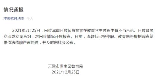 近日,网传天津咸水沽第二中学班主任肖某某在教育学生过程中发表不当言论,称往届学生家长不是高官就是富商,这届学生都是平民百姓,“你爸妈一个月挣多少钱,别怪我瞧不起你!XX的妈妈一年挣的钱都比你妈五十年挣的多。”25日,津南区教育局通报称,目前该教师已被停职,教育局将根据调查结果依法依规严肃处理,并及时向社会公布。情况通报2021年2月25日,网传津南区教师肖某某在教育学生过程中有不当言论。区教育局立即成立调查组,对网传情况开展核查。目前,该教师已被停职。教育局将根据调查结果依法依规严