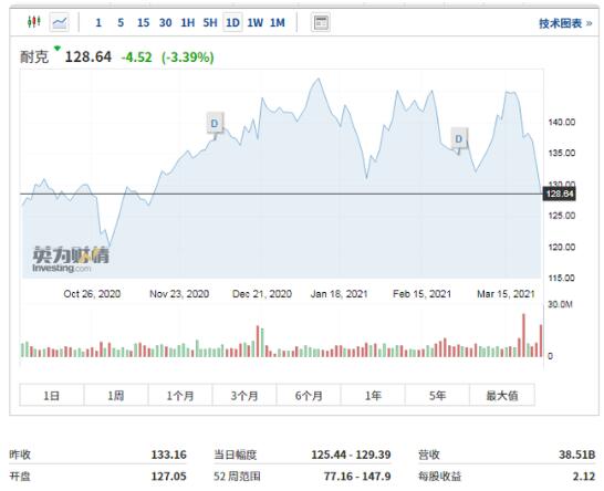 在昨夜美股反弹的情况下,美股耐克公司收盘跌3.39%,报128.64美元,单日流通市值蒸发约71亿美元,约合463亿元人民币。