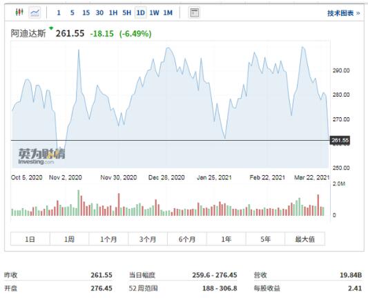 阿迪达斯25日在德国法兰克福交易所跌逾6.49%,报261.55欧元,单日流通市值蒸发约35亿欧元,约合270亿人民币。
