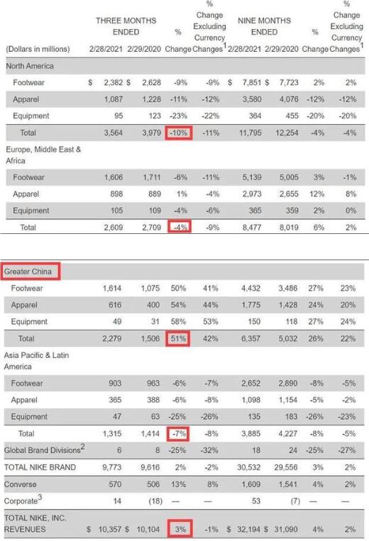 值得注意的是,3月18日,耐克刚刚披露2021财年第三财季业绩,由于新冠疫情蔓延,该公司在全球大部分地区的营收均出现下滑,只有在大中华区实现增长且高达51%,帮助其总营收保持正值3%。
