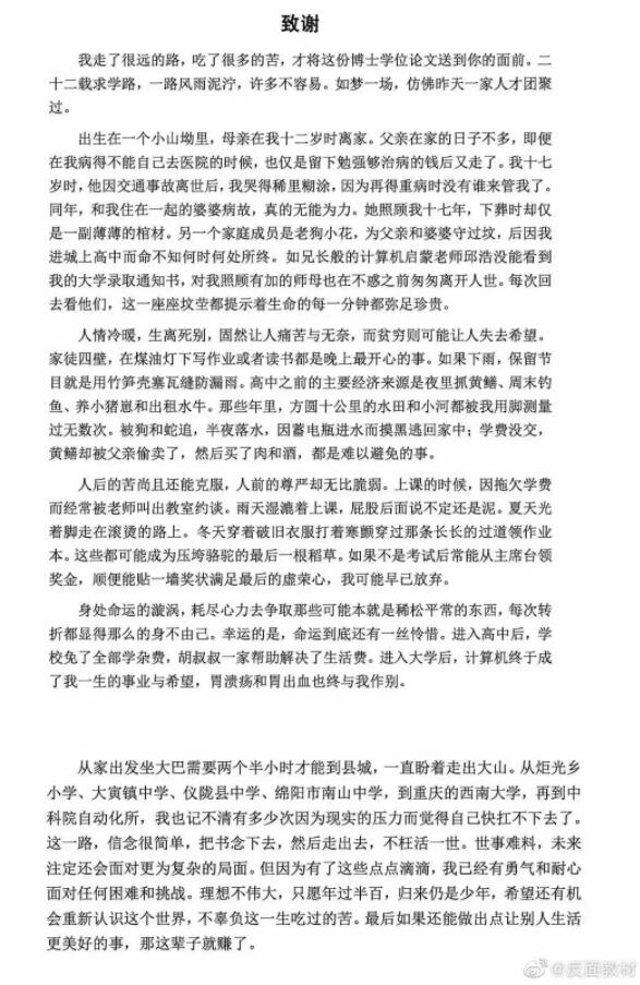上述文字来自于一篇博士论文的《致谢》部分。这篇情感真挚的《致谢》近日在豆瓣、知乎、微博等多个网络平台走红,作者在文中回顾自己如何一路走出小山坳、和命运抗争的故事打动了大批网友。