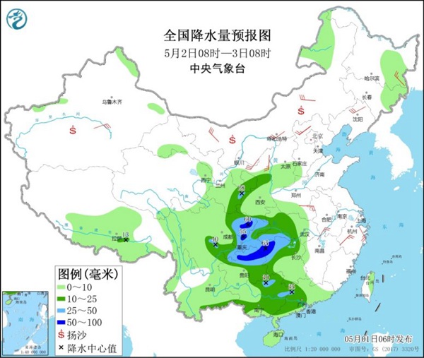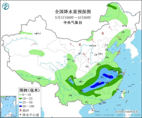 5月3日,黄淮西部、江淮大部、江汉东部、江南西部和北部、四川盆地西南部、贵州大部、华南西北部等地的部分地区有中到大雨,其中,安徽西南部、湖北东部、湖南中北部、江西北部等地的部分地区有暴雨(50~90毫米)。