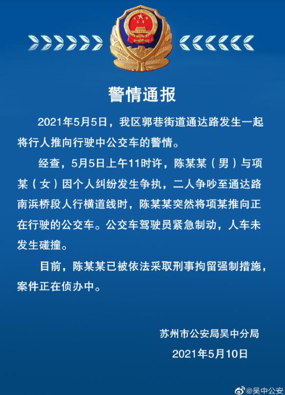 据苏州公安局吴中分局官方微博“吴中公安”通报,5月5日,该区发生一起将行人推向行驶中公交车的警情。目前,陈某某(男)已被依法采取刑事拘留强制措施。原标题:警方通报男子将女友推向行驶中公交车:已刑拘