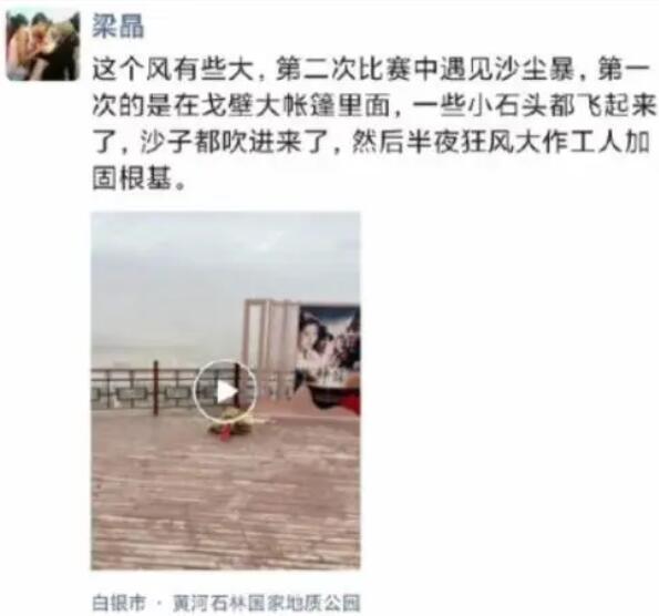 梁晶最后一条朋友圈发布于5月22日8点20分,他写道:“这个风有些大,第二次比赛中遇见沙尘暴,第一次的是在戈壁大帐篷里面,一些小石头都飞起来了,沙子都吹进来了,然后半夜狂风大作工人加固根基。”