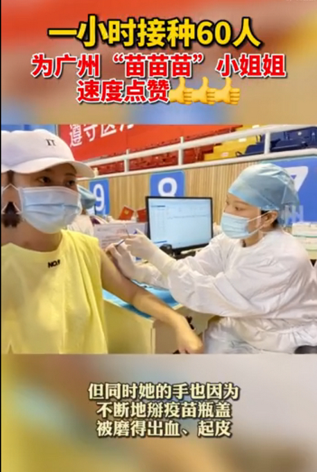 新冠病毒疫苗接种量不断创新高,离不开默默付出的医护人员。广州市花都区人民医院护士黄俊媚是有名的“快手”,一小时能为60人接种疫苗,同事们都在为她的专业和高速惊叹。但她的手也因不断地掰疫苗瓶盖,被磨得出血,干到起皮。