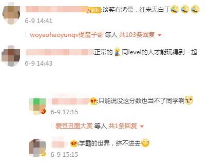 网友评论:“谈笑有鸿儒,往来无白丁”、“同lever的人才能玩得到一起”、“没这分数也当不了同学”。