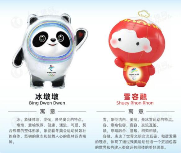 2019年9月,北京2022年冬奥会吉祥物“冰墩墩”和冬残奥会吉祥物“雪容融”正式亮相。据了解,“冰墩墩”以熊猫为原型进行设计创作,象征着冬奥会运动员强壮的身体、坚韧的意志和鼓舞人心的奥林匹克精神;“雪容融”以灯笼为原型进行设计创作,表达了世界文明交流互鉴、和谐发展的理念,体现了冬残奥运动员的拼搏精神和激励世界的冬残奥会理念。
