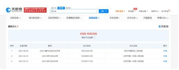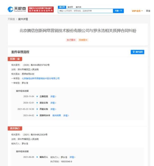 中国经济周刊-经济网讯 天眼查APP显示,近日,罗永浩再成被执行人,案号为(2021)粤0304执22626号,执行标的18533340元,执行法院为深圳市福田区人民法院。相关案件涉及北京腾信创新网络营销技术股份有限公司与罗永浩质押合同纠纷。
