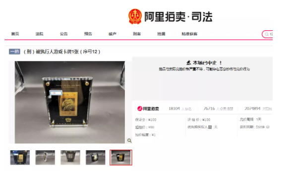 拍卖介绍中,司法平台提醒,该卡牌使用年限不明,长久未使用,无任何配件及说明书,为二手物品,品牌真伪不详,以实地看样为准。令人意想不到的是,根据阿里拍卖最新显示的竞拍结果,该游戏卡牌竞拍出价最高已超过8700万元,整个拍卖有18104人报名,设置提醒有76716人,围观超200万次。