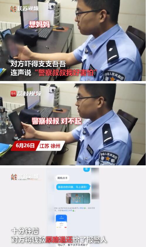 近日,江苏徐州一初中生报警称,自己被网友骗了100元后被拉黑。民警添加对方为好友后,视频对方直接亮出身份,严肃告知其法律责任。对方被吓得连声说“警察叔叔,我好害怕”。十分钟后,对方将所骗钱款原路退回。