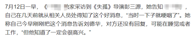 12日有媒体联系到了《失孤》导演彭三源,她表示自己几天前就知道了这个消息,已经把好消息告诉了刘德华,只不过对方还没有回复。