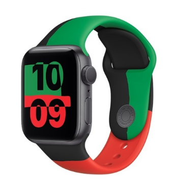 新款Apple Watch 6的铝制表壳背面激光蚀刻了“ Black Unity”。运动手环有黑色,绿色和红色两种颜色可选,其灵感来自泛非国旗。它还在金属引脚上激光蚀刻了“真相,力量,团结”。