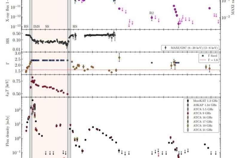 一个国际天文学家团队对称为MAXI J1348–630的黑洞X射线双星进行了全面的无线电和X射线监控。观测活动为探源的紧凑型和瞬态射流的发展提供了重要的见识。这项研究发表在3月22日在arXiv.org上发表的一篇论文中。黑洞X射线双星(BHXB)是由恒星伴侣(通常是低质量的恒星)绕行的黑洞组成的双星系统。在BHXB中,X射线是由物质从次级伴星吸积到初级黑洞中产生的。当X射线通量显着增加时,通常会在爆发中检测到此类系统。 MAXI J1348–630最初于2019年1月26日被国际