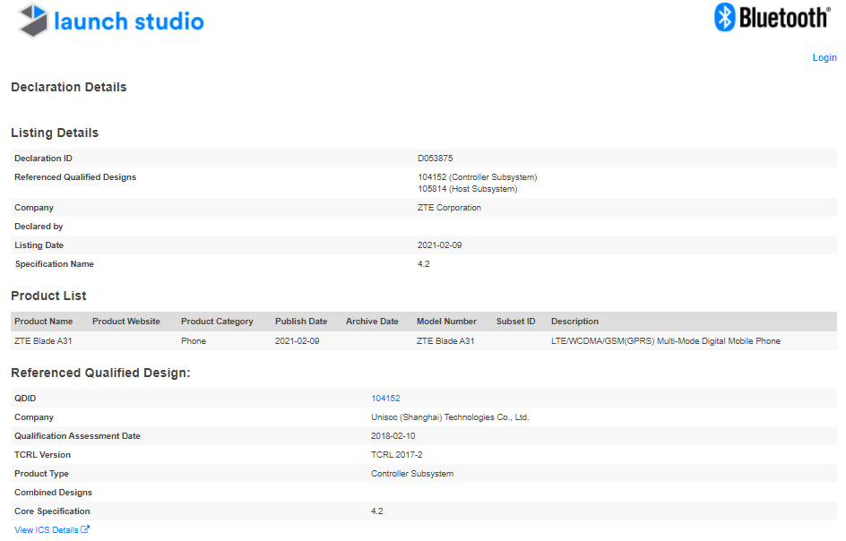 根据蓝牙SIG列表,中兴Blade A31将具有蓝牙4.2和LTE。它还将由UNISOC处理器供电。