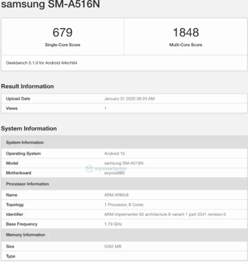 三星最近推出了三星Galaxy A51智能手机。事实证明,现在,该公司可能还会推出其5G变体。三星Galaxy A51 5G智能手机最近在Geekbench数据库网站上被发现。让我们看一下三星Galaxy A51 5G智能手机的关键规格和Geekbench得分。从Geekbench列表中可以看出,三星Galaxy A51 5G在单核测试中获得679分,在多核测试中获得1,848分。该设备将由该公司内部的Exy