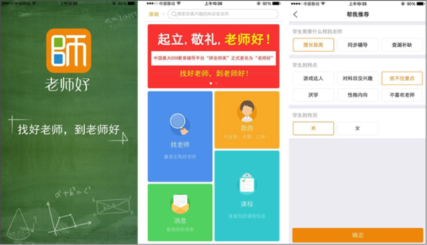 “老师好”成立于2014年9月,原名“师全师美”,今年1月上线,并于5月正式完成更名。教师覆盖小中高全部科目,当前累计老师注册用户数5万人,学生用户数20万人,平台上每月可实现15万的订单,每单平均2-4小时。