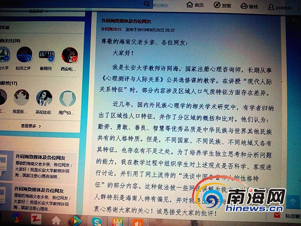 许同海教授在致歉信中介绍,自己是国家注册心理咨询师,长期从事《心理测评与人际关系》公共选修课的教学。在讲授“现代人际关系特征”时,部分内容涉及区域人口气质特征方面存在差异。为了培养学生独立思考和分析问题的能力,他在教学过程中组织学生对上述观点是否科学、客观进行讨论,并引用了网上流传的“浅谈中国各省市人的性格特征”的部分内容。这种做法被一些网民误解为自己本人对部分区域人群特别是海南人持有偏见,并对教师提出批评与质疑。特此,许同海教授衷心感谢大家的关心!诚恳接受大家的批评!
