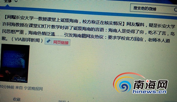 “两微”疯传长安大学教授诋毁海南 引发海南网友热议要求道歉
