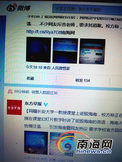 南海网海口9月25日消息(南海网记者刘培远)9月24日,一则长安大学教授许同海课堂诋毁海南的帖子在海南微信、微博的朋友圈里疯传,引发海南网友热议,要求教授本人向海南人道歉,并要求长安大学官方也给予回应。