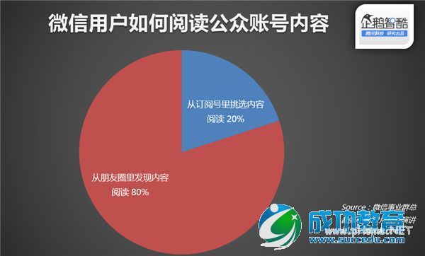 这是来自张小龙在12月微信公开课上的一个数据分享。他在演讲中提到,订阅号有非常多的阅读量来自朋友圈,这符合2/8分布原理,“20%的用户到订阅号里面去挑选内容,然后80%的用户在朋友圈里去阅读这些内容。”由此看来,有着大规模粉丝号的账号如果不能生产有吸引力的内容,同样无法提升阅读数。
