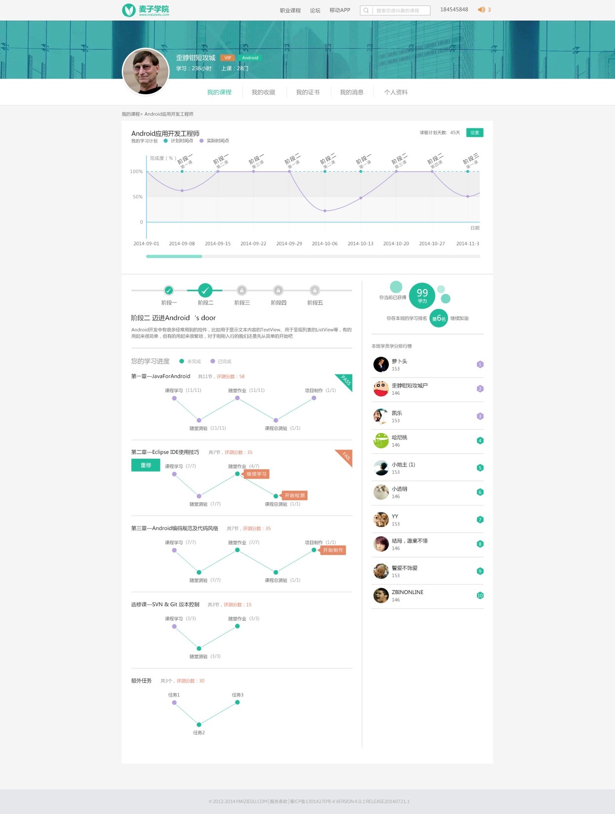 系统会引导学员自动生成一个属于自己个性化的学习计划图表,同时会告诉学生计划图内每一个阶段需要完成各种任务,比如一周内要看那几个视频,什么时候要完成那些练习,需要在什么时候提交代码,什么时候需要在线直播听课等等,每个环节紧紧联系,在此基础上学生还能看到同班同学的学习排名等,最关键的还不是这个,因为老师也有一个后台,老师可以随时看到班上每一个学生的进度,在随时答疑互动的前提下,一旦发现学员的实际进度与计划图不符的时候会及时与该学员沟通并进行人工干预的督促,通过整套系统的过关,配合在线练习,在线实验,录播,直播等环节之后学员最终顺利完成整套课程,并获得相关认证,同时生成自己的学习过程数据表。