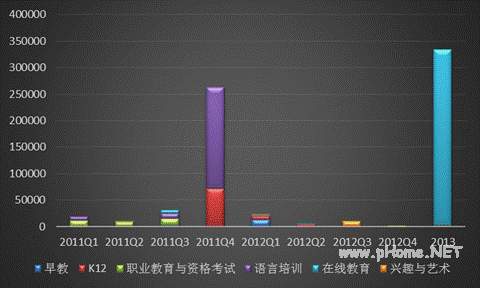 2013年月在线教育类投资金额就占到近三年来教育服务行业投总额的43%。其中早教类为在线教育领域的39%,其次是语言类25%,其他细分领域在10%一下。从投资思路看,早教领域还没有出现有影响力的在线教育品牌,市场处于成长期,投资人对未来的增长潜力普遍看好。