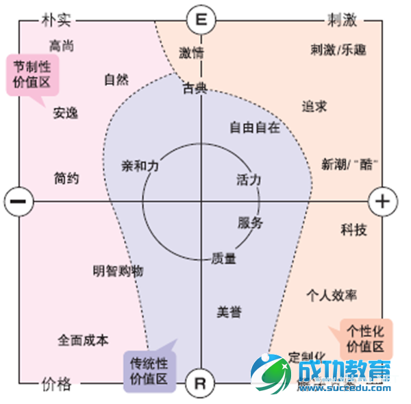 注:E(emotion)表示价值元素的感性程度强; R(ration)表示价值元素的感性程度强;+表示价值元素对消费有促进作用,—表示价值元素对消费有抑制作用。在横轴上越向右表示价值元素对消费促进作用越强,越向左表示价值元素对消费抑制作用越明显。