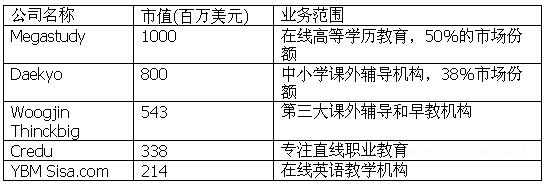韩国教育服务行业主要由5家上市公司,在线教育的有三家公司分别涉及在线学历教育,在线职业教育和在线英语培训。