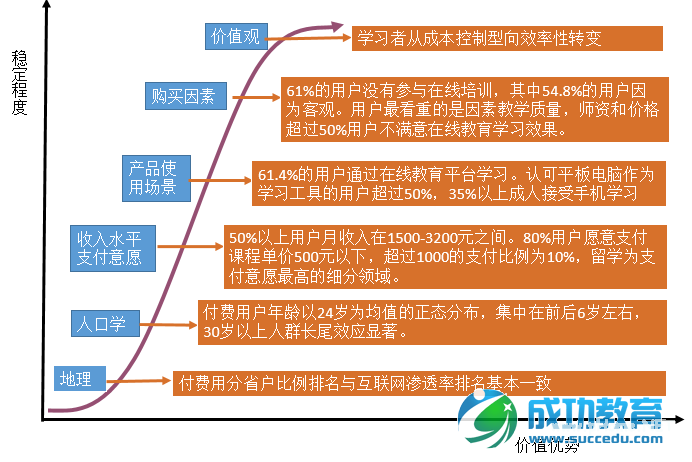 从以上数据进一步支持了上文关于互联网普及率作为技术手段推动教育行业发展的观点。值得关注两点用户支付意愿和购买影响因素。超过80%以上的用户愿意为80元以下的课程支付。没有参加在线培训的用户中超过50%的用户因为客观条件制约,这其中主要的因素是收入水平和个人时间有限。从用户对在线教育最关注的因素来看在线教育品牌效应对于用户的影响有限。用户价值观的转变对行业发展影响最重要,用户价值观的转变是产业演变本质的需求变化。罗兰贝格咨询公司将用户的价值需求提炼为全面成本、明智购物,个人效率和个人效率等19个价值主张,从上文分析电子商务对用户行为塑造集合调差数据,可以看出中国年轻用户已经从价格敏感的传统价值区向注重效率的个性化价值区转变。用户对于个性化教育服务的需求变化正是在线教育发展的根本动力。
