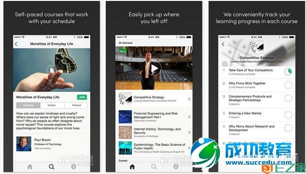 Coursera 的 App 经过多个版本的迭代更新功能已经相当的完善,几乎可以代替网页版为你的学习提供更多的便利。你可以通过移动端完成选课,学习,论坛交流等一系列重点环节。应用还支持视频缓存,方便在没有网络的时候可以继续学习。笔者最喜欢的就是 Coursera,已经获得了十多张免费证书。Coursera 对我最大的吸引力是课程覆盖全面,访问便捷,对于一些难度较高的课程可能会有中文字幕支持。欢迎大家体验。