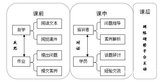 3.课后——网络研修。通过课后的网络研修平台互动,促进知识内化和深度对话。这是不同于中小学“翻转课堂”之处。一是由于中小学生的学习是长期连续的,而参训教师的集中培训是短期的且往往围绕一个主题。如果没有课后的网络互动,就会使所学知识的得不到巩固和深化。二是由于中小学生是以学习为主的,而教师却是以工作为主,他们通常是利用课余和休息时间进行学习。网络研修平台,不仅为教师学习提供了环境和空间,还构建了学习型组织(如学科研修共同体)。