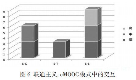 像sMOOCs一样,cMOOCs经常围绕教材或预设的开放教育资源列表、期刊文章、多媒体来创建在线的读/学习包。鼓励学生通过将他们认为有用的网络化学习资源推荐给其他学习者来增加这种资源的汇聚性,并将其整合到个人学习网络中。因此,学生和内容的交互处于中等水平。