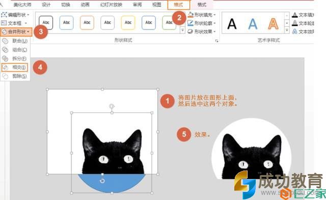 3、选中之后,单击“图片工具”中的“格式”选项卡,在选择合并形状;