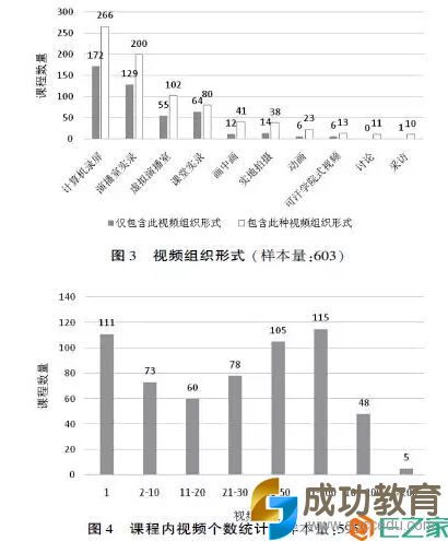 在622门可浏览课程中,教学组织仍主要依赖于视频,除19门课程无视频或视频内容不可浏览的课程外,剩余的603门课程的视频组织形式如表二所示,459门课程视频只有一种组织形式,113门课程包含两种视频组织形式,27门课程包含三种视频组织形式,分别有2门课程由四种和五种视频组织形式。