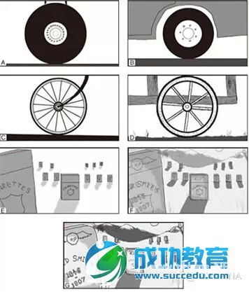 接下来我们使用一个简单的场景对匀称剪辑进行演示。为了表现一个人返乡,导演拍摄了一系列关于飞机轮胎、汽车轮胎、自行车轮胎和马车车轮逆时针旋转的特写镜头。在镜头构图中,这四种大小相等的圆形居中,而且相互很匹配。作为一名剪辑师,如果你的目标是缩短人物的旅行时间,那么就可以从一个轮胎镜头叠化到另一个轮胎镜头直到以马车车轮的特写镜头告终,然后切入人物坐在一群羊之间晒玉米秆,后面是一架骡子拉的马车(见下图A—D)。观众明白通过叠化来转场是为了缩短时间。这种对轮胎至车轮渐次过渡的技术处理告诉观众人物离农村老家越来越近。形状和构图的连贯有助于将观众的目光集中于画面中央,从而理解镜头所表达的内容。同时,随着画面一致的叠化,人们对地点和“环境”变化逐渐适应,声音也顺理成章地从嘈杂向安静过渡。