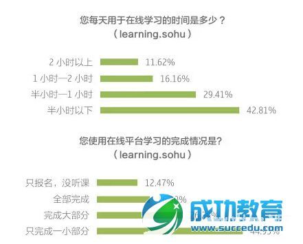 2014年搜狐教育年度消费者调查报告显示,42%的人每天在线学习时间不超过半小时,学习时间超过2小时的人只占到11%。